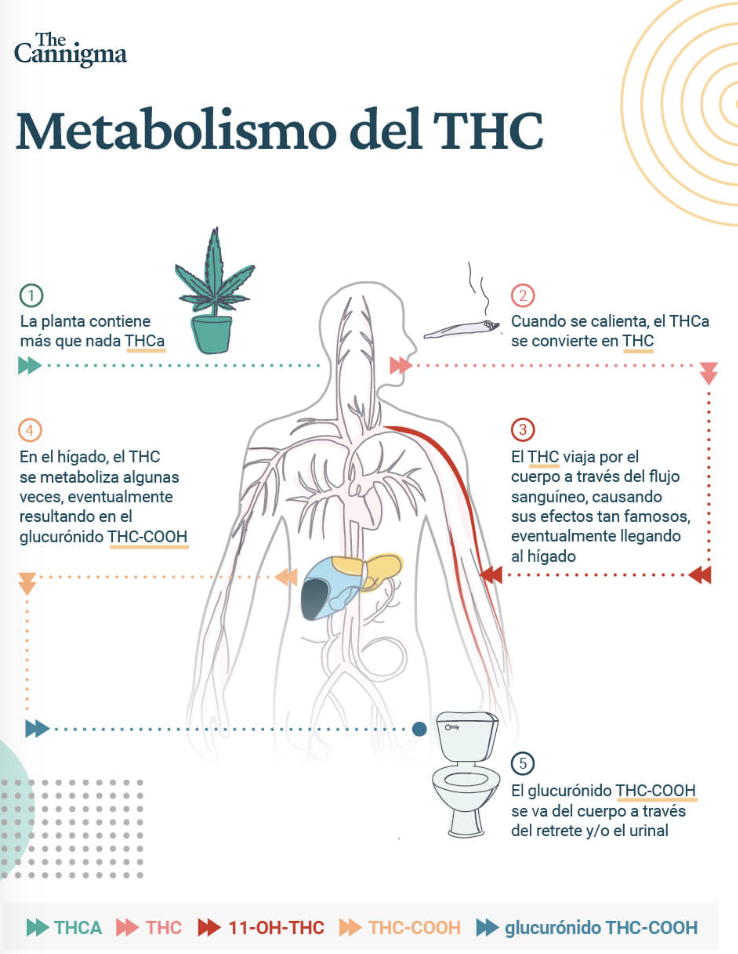 El hígado transforma el THC utilizando enzimas, principalmente del grupo CYP450 (como CYP2C9 y CYP3A4). De esta transformación surgen dos metabolitos importantes: el 11-OH-THC, que es activo y psicoactivo, y el THC-COOH, que ya no tiene efecto psicoactivo, pero permanece en el cuerpo por mucho tiempo.